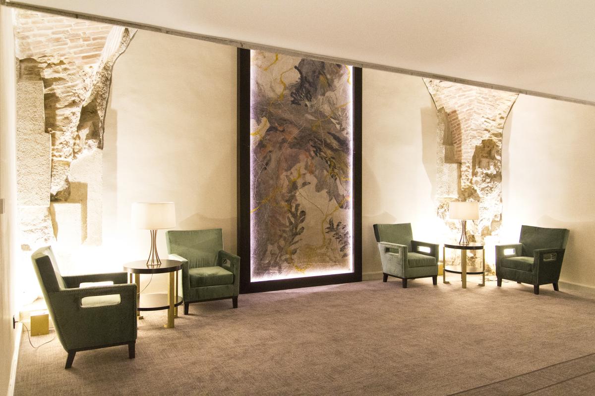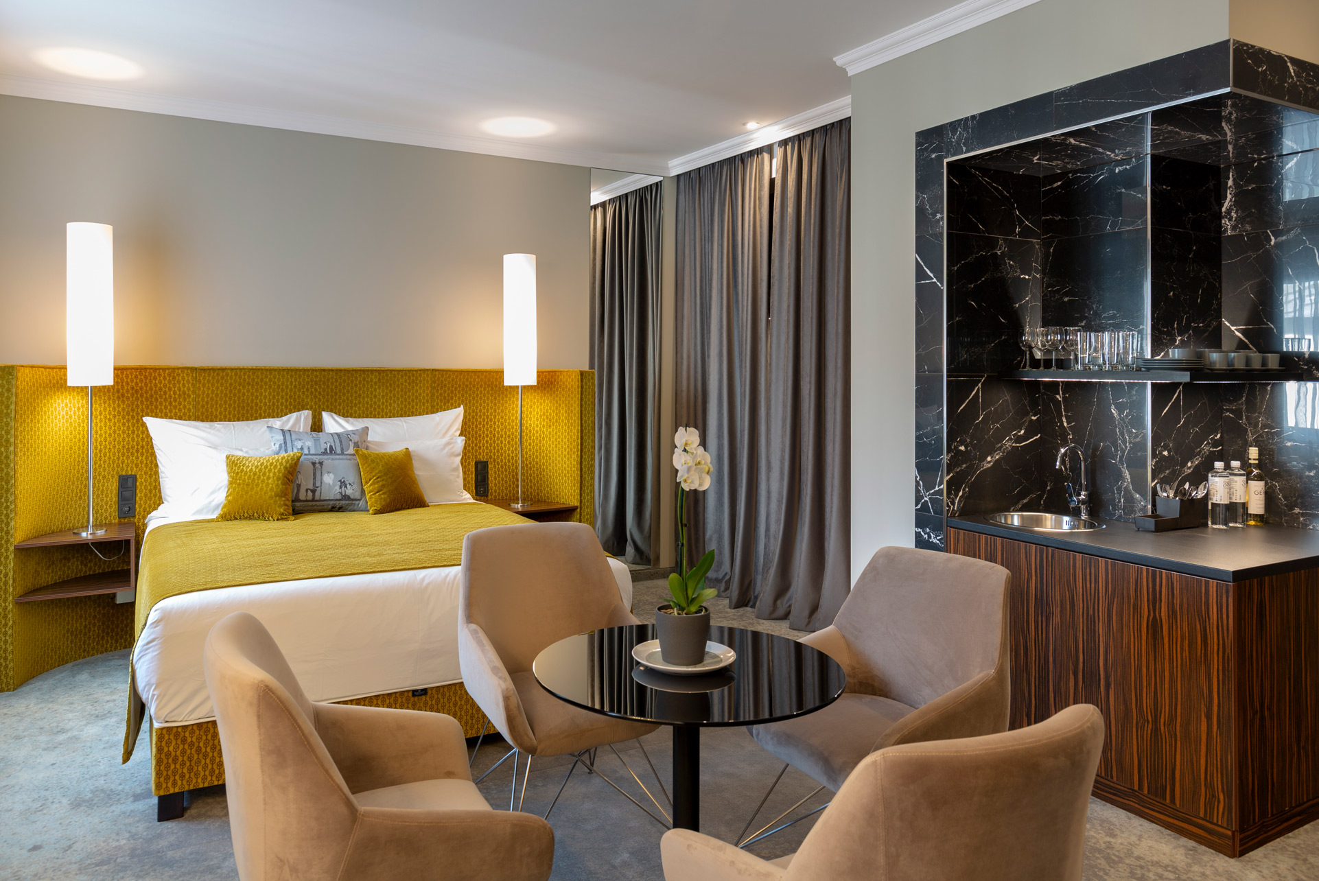 A koncepció középpontjában a bézs árnyalatok, valamint a mélykék és a nude színek kifinomult harmóniája áll. A természetes tónusokat karakteres anyaghasználat egészíti ki: az erőteljes szürkés rózsa erezetű márvány több helyiségben is visszatérő, hangsúlyos elemként jelenik meg, elegáns, mégis kortárs atmoszférát teremtve.