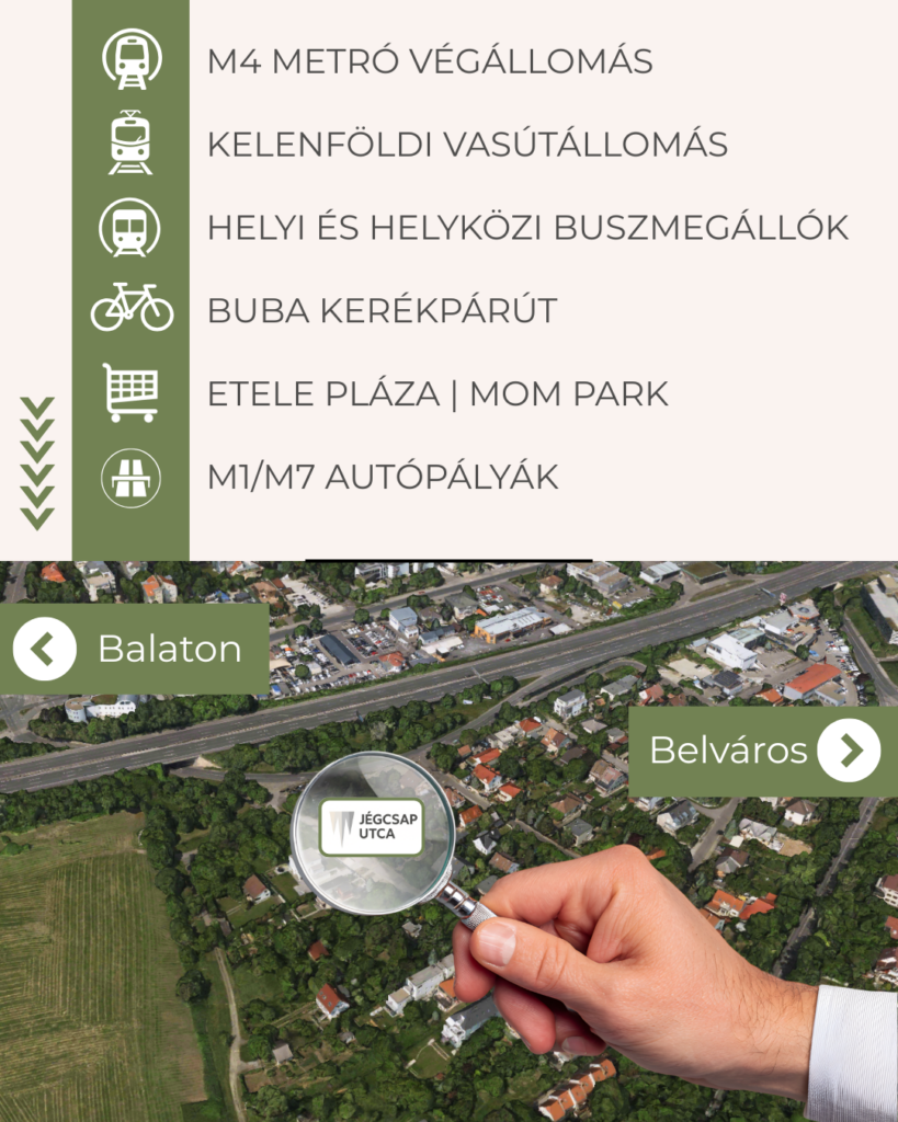 A Jégcsap utca 18. szám alatt épülő új társasház Budapest 11. kerületének egyik kedvelt zöldövezeti részén található Őrmezőn. A madárcsicsergős, csendes környezet ideális otthont kínál azoknak, akik nyugalomra vágynak, miközben fontos számukra a belváros közelsége. Az M1/M7 autópályák kivezető szakasza pedig lehetővé teszi, hogy 1 órán belül a Balaton partjaiban gyönyörködhessünk. A közelben több tömegközlekedési pont is található, így a család minden tagja könnyedén eljuthat munkahelyére, vagy az iskolába.