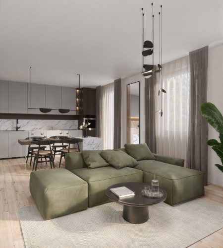 A lakberendezési koncepció lényege a mély tónusok, az olíva zöld és a sötét fa harmóniája, amelyet gondosan megtervezett fények tesznek intimebbé és kiegyensúlyozottabbá. Az összhatás letisztult, elegáns, mégis kényelmes enteriőrt eredményez.